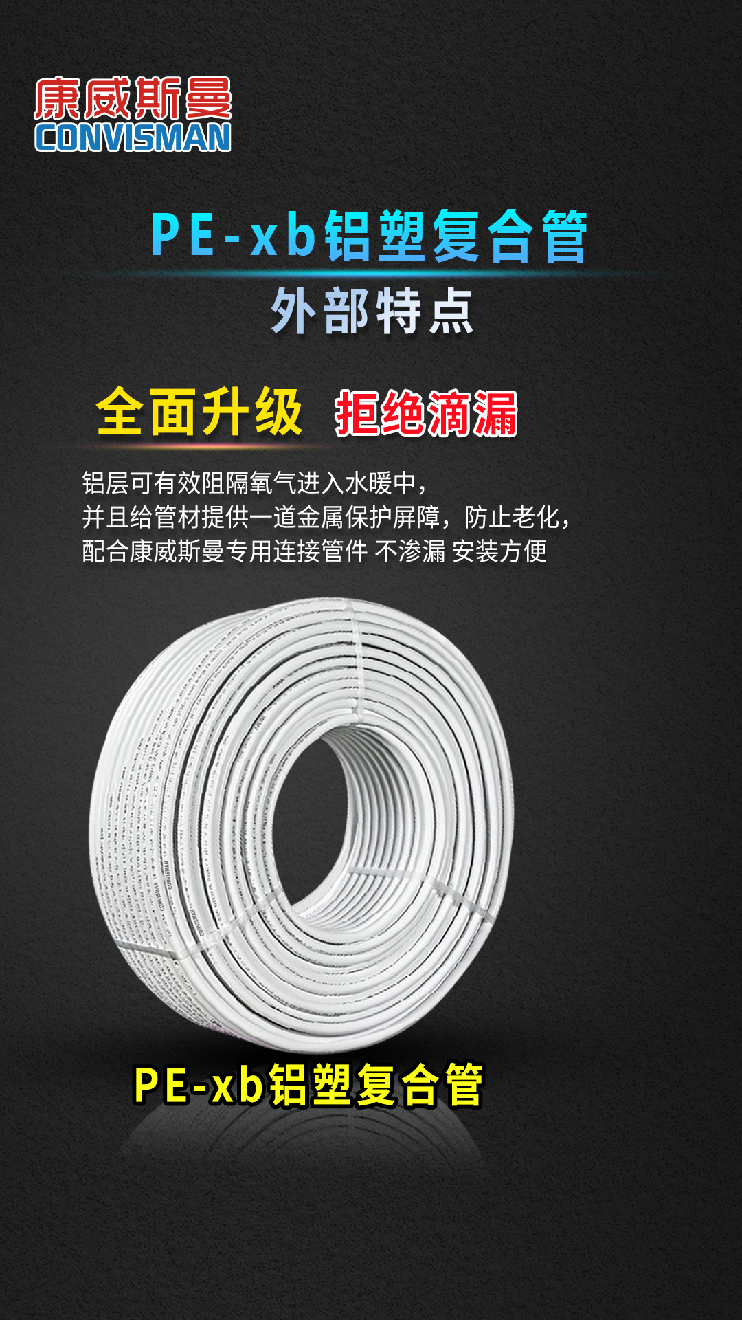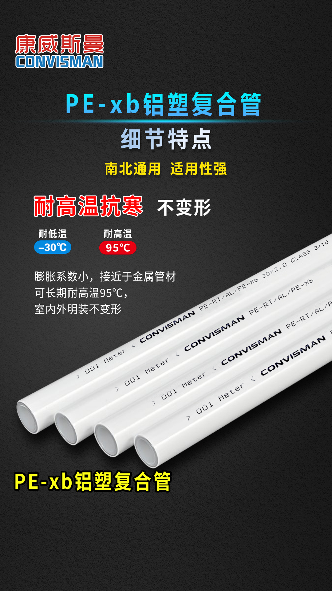 康威斯曼PE-XB铝塑复合管:卫生无毒,无添加任何有毒物质,符合欧盟卫生标准。 2.能承受PH值在1-14之间的酸和碱的腐蚀,耐高压高温,阻燃。 3.内壁光滑,不积水垢,流量同比增加30% 4.保温节能,导热系数仅为金属管的1/200,用于热水管道保温节能效果极佳 5.铝层夹层,膨胀系数小,韧性好 6.重量轻,为金属管道的1/7,易于切割加工 7.热熔连接,安装简单,使用寿命长,在规定使用条件下寿命长达50年 8.采用铝层夹层,可确保氧气不入内,易弯曲,伸直,不反弹 9.对接焊使用温度可达90℃ ,工作压力为1.25Mpa,搭接焊使用温度为82℃ ,工作压力为0.86Mpa。