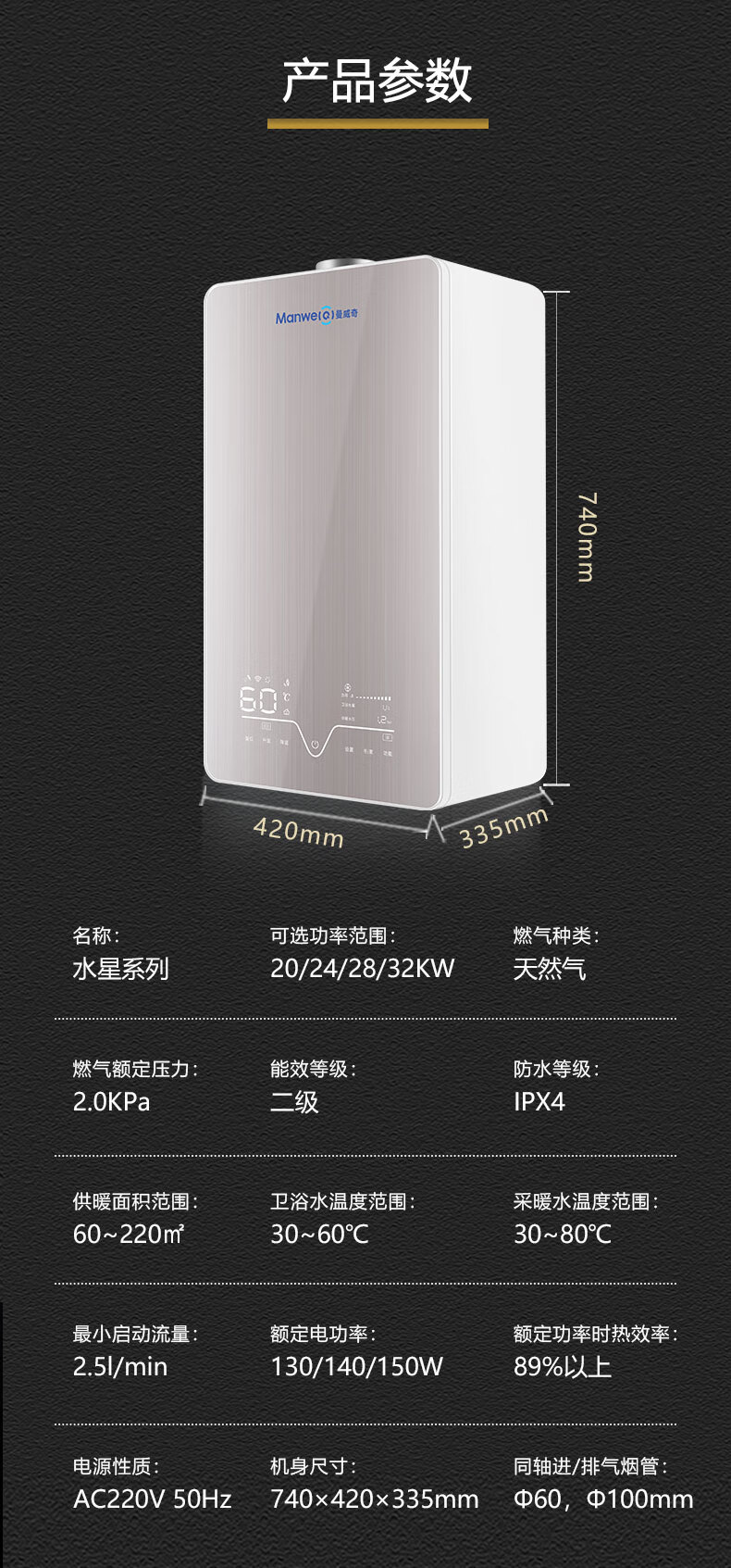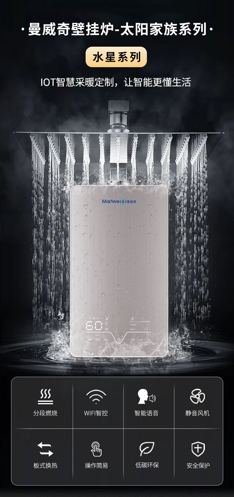 水星系列语音智能款燃气壁挂炉24KW:国产智能壁挂炉,手机APP控制,语音对话,语音报错,分段燃烧,司服热水,气候补偿,大数据后台,远程售后,远程维修,热水稳定